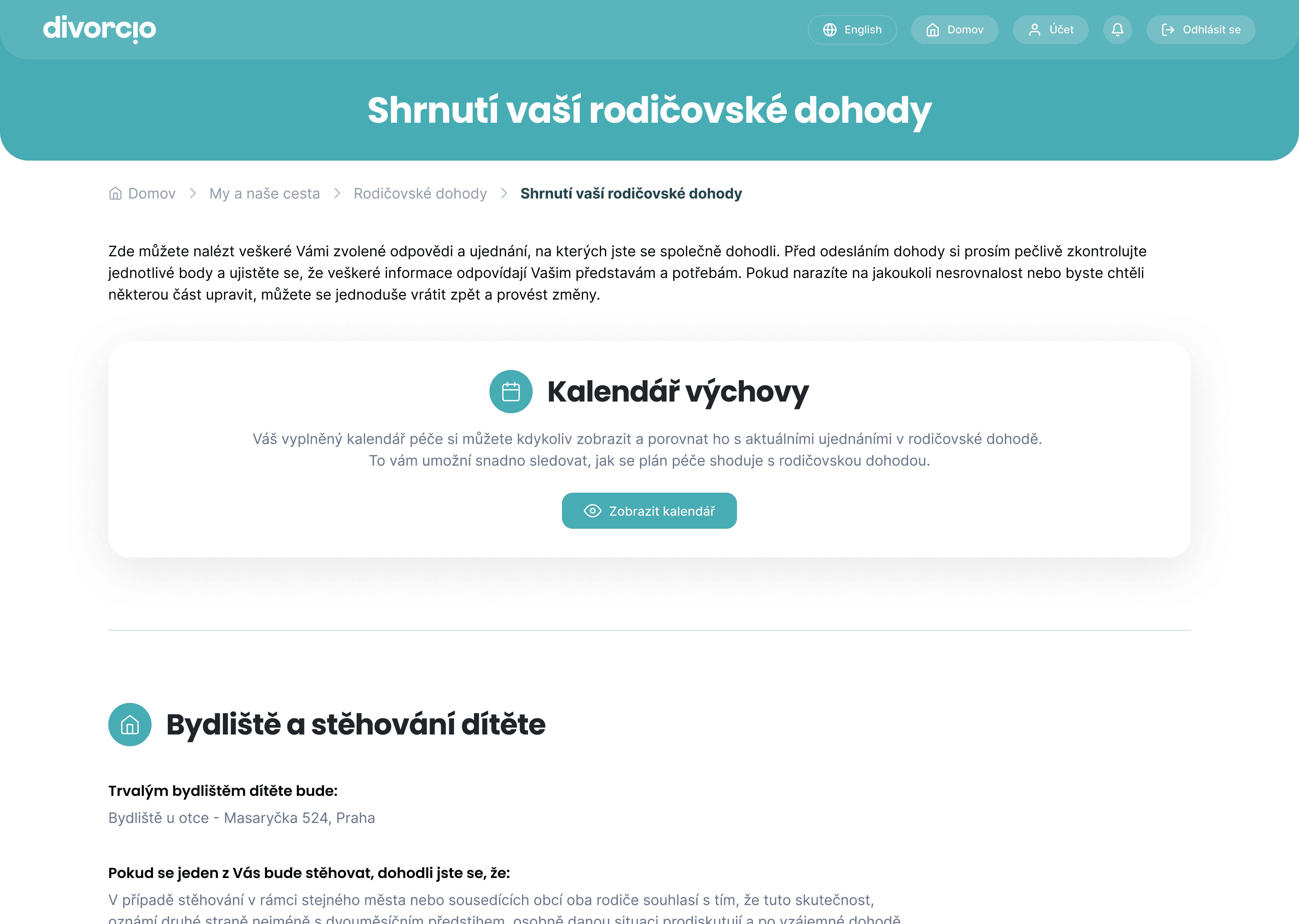 Vidím postup plnění a míru shody, komunikuji s partnerem u jednotlivých částí a společně ladíme všechny dokumenty – včetně kalendáře péče o dítě.